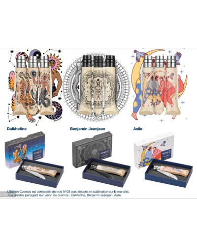 En stock  Vue rapide Opinel Edition COSMOS 3 Coffrets Accueil Prix 130,00 € Edition Limitée Octobre 2025 composée de 3 coffrets N°8 Lame numérotée 8200 exemplaires Modèle Dalkhafine et Asile lame inox et manche décor...
