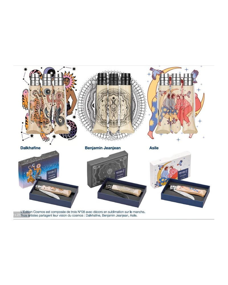 Modèle Dalkhafine et Asile lame inox et manche décor sublimation Hêtre vernis
